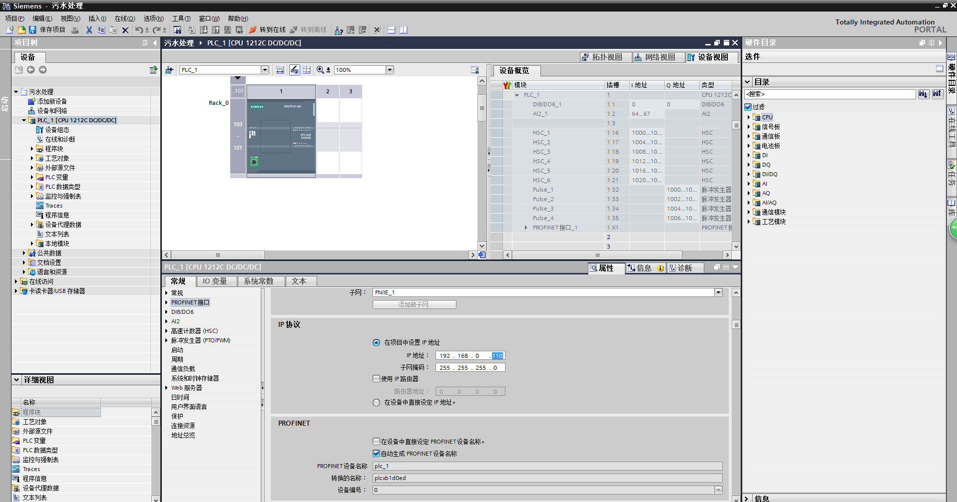 點擊右下角的添加按鈕,將你選擇的控制器添加到設備內,同時自動進入到“項目視圖”內。你也可以在任意時候雙擊左面“設備組態(tài)”菜單進入到控制器的“設備視圖”中。在下圖中,能看到設備概覽里控制器的詳細數據,也需要設置一些關鍵參數才能讓控制器正常工作。