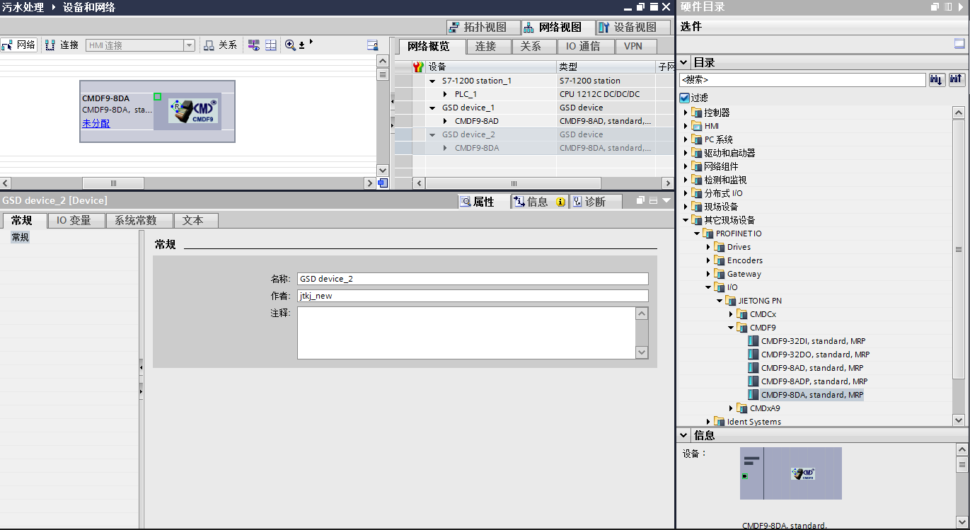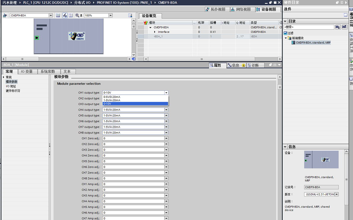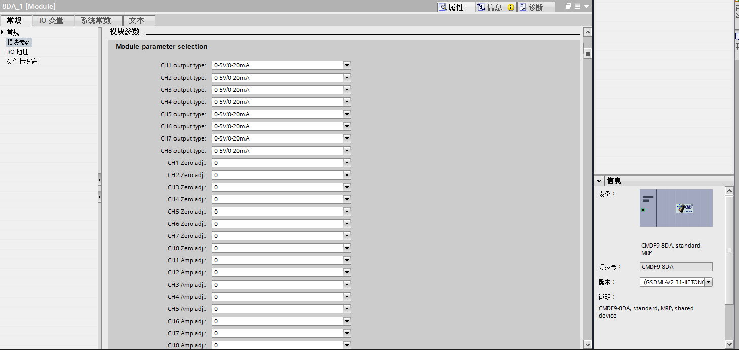 點開后在I/O欄目里找到剛剛安裝JIETONG PN下的CMDF9中的CMDF9-8DA,這是8通道標準模擬量輸出模塊。