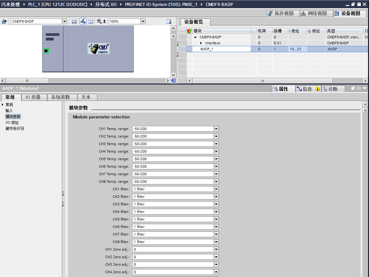 利用TIA Portal軟件配置掛接在S7-1200/S 7-1500系統(tǒng)中的CMDF9-8AD標準模擬量采集電壓、電流和液位信號、CMDF9-32DI采集閥門位置和行程開關信號、CMDF9-8ADP熱電阻采集生化反應溫度、再由CMDF9-8DA模擬量輸出模塊控制溫度調節(jié),并由CMDF9-32DOP輸出報警指示和閘閥連鎖控制。